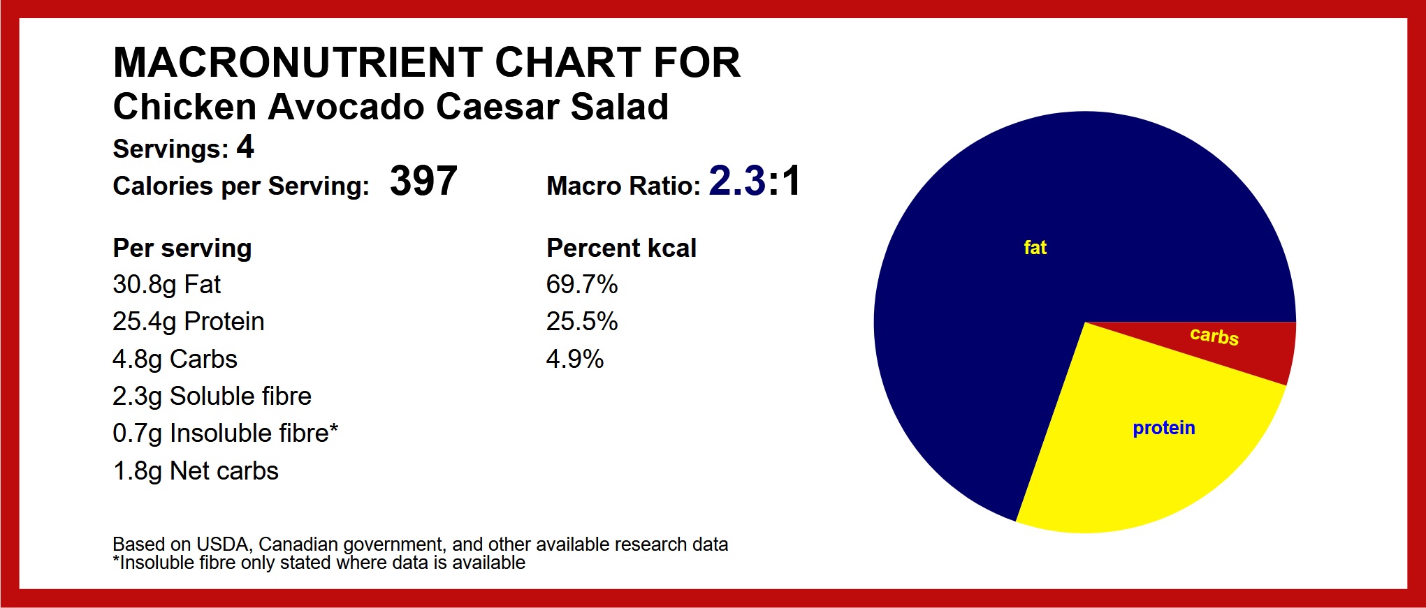 6. To plate, place one serving of the grilled chicken either on top of the salad or onto the plate. Fan out the chicken. Add one serving of the Avocado Caesar Salad next to the chicken. Serve immediately while fresh. Enjoy.